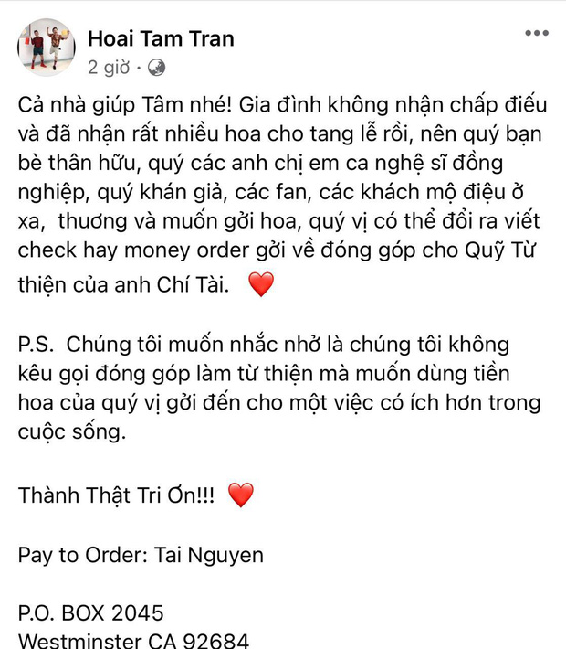 Đặc biệt, Hoài Tâm đã lên tiếng làm rõ thông tin nhận tiền thay cho vòng hoa đến viếng. Hoài Tâm chia sẻ: "Cả nhà giúp Tâm nhé. Gia đình không nhận chấp điếu và đã nhận rất nhiều hoa cho tang lễ rồi, nên quý bạn bè thân hữu, quý các anh chị em ca nghệ sĩ đồng nghiệp, quý khán giả, các fan, các khách mộ điệu ở xa, thương và muốn gởi hoa hay muốn phúng điếu, quý vị có thể đổi ra tiền gởi về đóng góp cho quỹ từ thiện của anh Chí Tài. Chúng tôi muốn nhắc nhở là chúng tôi không kêu gọi đóng góp làm từ thiện mà muốn dùng tiền hoa của quý vị gởi đến cho một việc có ích hơn trong cuộc sống".