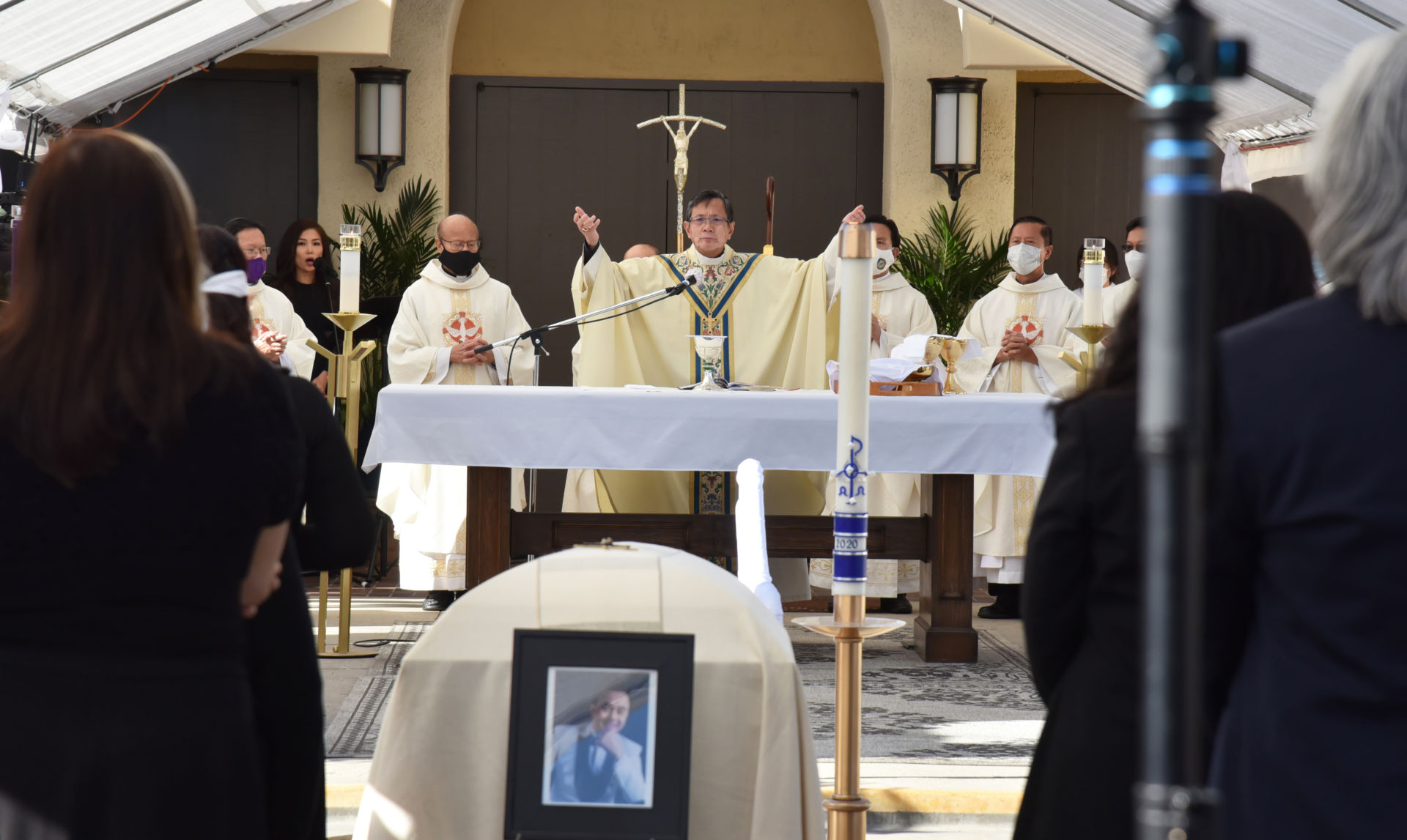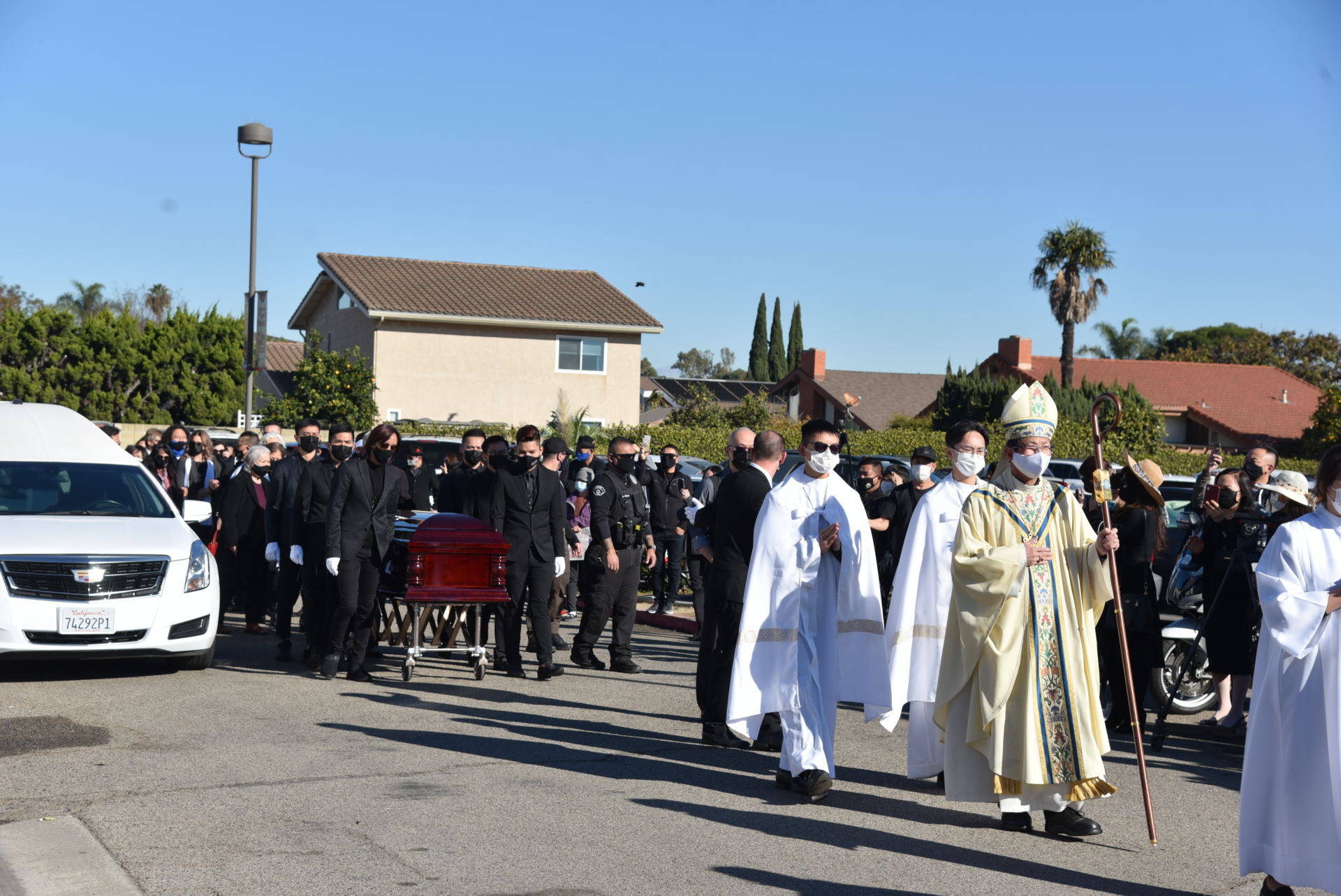 Linh cữu danh hài Chí Tài được Giám Mục Nguyễn Thái Thành, giám mục phụ tá Giáo Phận Orange, đón vào nhà thờ. (Hình: Văn Lan/Người Việt)
