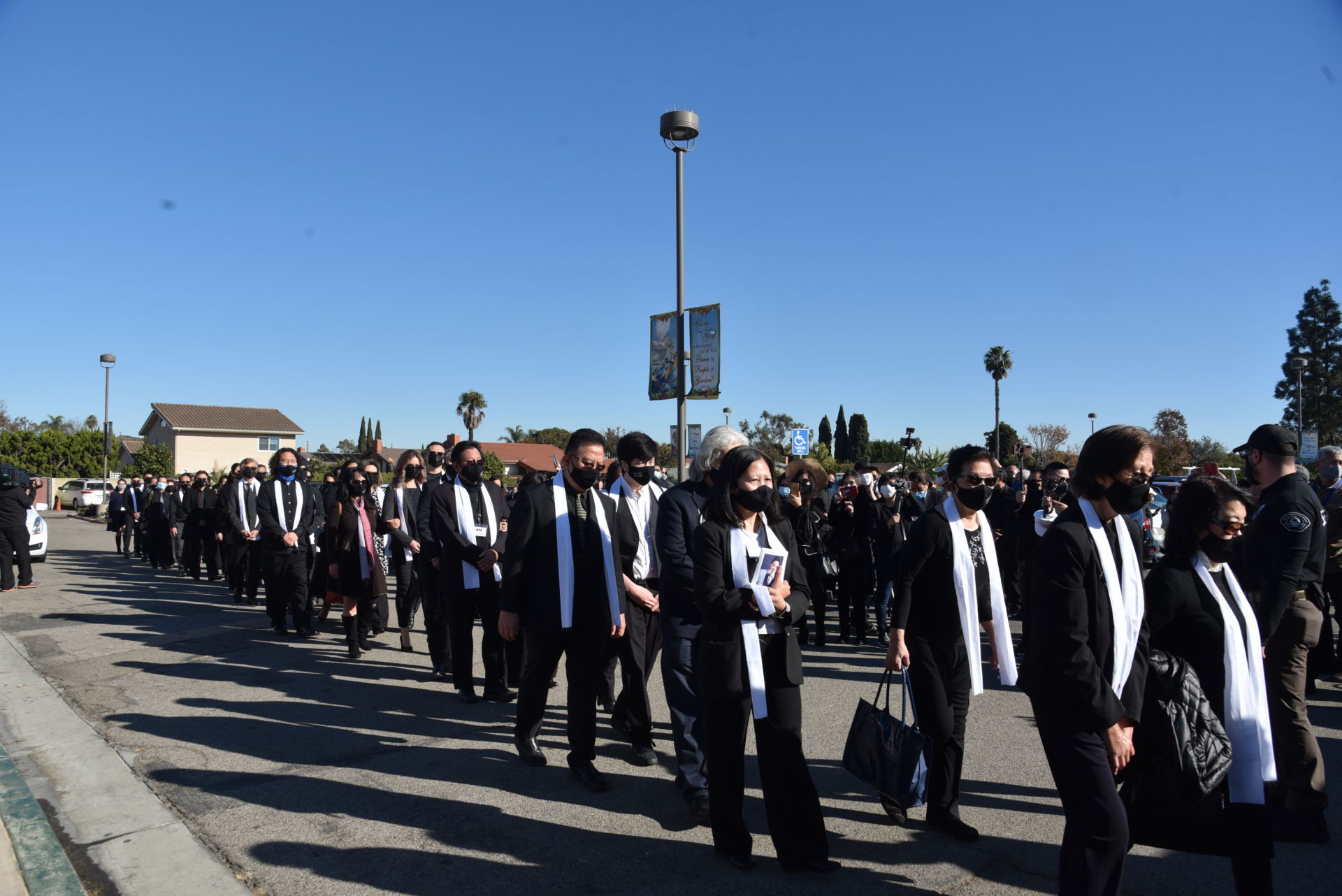 Đông đảo người hâm mộ, thân hữu, ca sĩ, gia đình cùng đến dự Thánh Lễ An Táng danh hài Chí Tài. (Hình: Văn Lan/Người Việt)