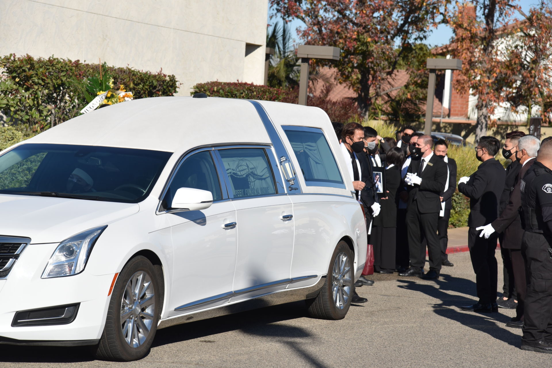 Xe tang chở linh cữu nghệ sĩ Chí Tài tới nhà quàn Peek Family Funeral Home để hỏa táng. (Hình: Văn Lan/Người Việt)