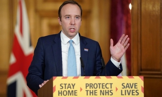 Bộ trưởng Y tế Matt Hancock tại một cuộc họp báo ở số 10 phố Downing hồi tháng 4. Ảnh: AFP.