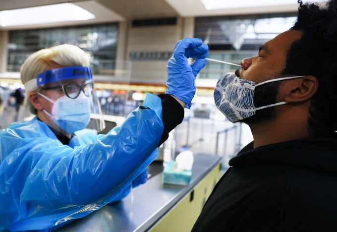 Nhân viên y tế lấy mẫu xét nghiệm Covid-19 tại sân bay quốc tế Los Angeles, Nam California, Mỹ, hôm 22/12. Ảnh: AFP.