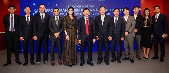 Doanh nhân Thuỷ Tiên đại diện tập đoàn ký kết với phía Hàn Quốc về việc phát triển chuỗi cửa hàng miễn thuế tại Việt Nam. Hai con trai Louis Nguyễn (chồng Tăng Thanh Hà) và Phillip Nguyễn (đầu tiên và thứ hai từ trái qua) có mặt bên bố mẹ và các em trong sự kiện này.