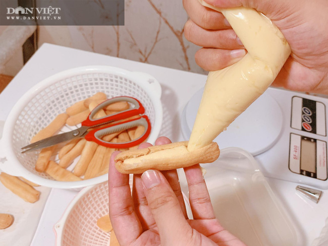 - Cho kem custard vào túi bắt kem và cho vào ngăn mát tủ lạnh chờ bánh chín.