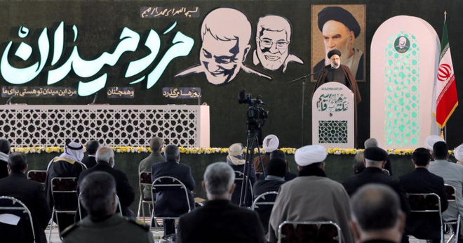 Bộ trưởng Tư pháp Iran Ebrahim Raisi phát biểu tại Đại học Tehran nhân kỷ niệm một năm ngày tướng Qassem Soleimani bị ám sát . Ảnh: AFP