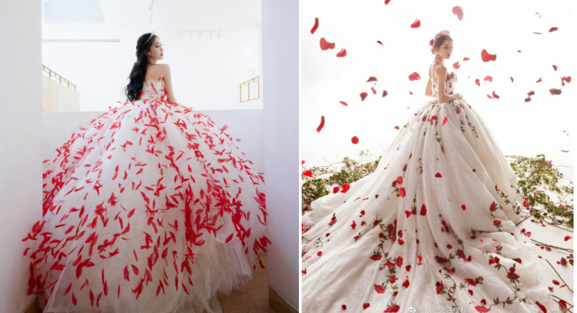 Theo Sina, tối 31/12, Angelababy tham gia bữa tiệc giao thừa của Đài truyền hình Chiết Giang. Nữ diễn viên diện đầm công chúa mềm mại, bồng bềnh, với điểm nhấn là những sợi lông vũ đỏ. Khán giả nhận ra Địch Lệ Nhiệt Ba từng lăng xê phong cách tương tự. Cả hai còn giống nhau ở chỗ cùng đội vương miện. Ảnh: Sina.