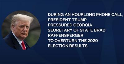 Tổng thống Donald Trump đe dọa kiện (intends to sue) Tổng Thư Ký bang Georgia ông Brad Raffensperger vì đã ghi âm cuộc điện thoại của họ vào thứ Bảy, trong đó tổng thống yêu cầu ông ta "tìm kiếm " phiếu bầu để chuyển bang Georgia thành màu đỏ trước ngày 6/1.