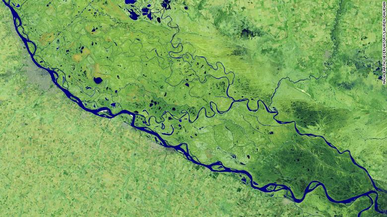 Mặc dù bức ảnh này có vẻ như cho thấy một ốc đảo xanh tươi, ảnh chụp vệ tinh của NASA cho thấy tình trạng khô cằn ở vùng lưu vực sông Paraná, Argentina.
