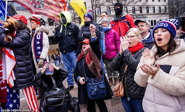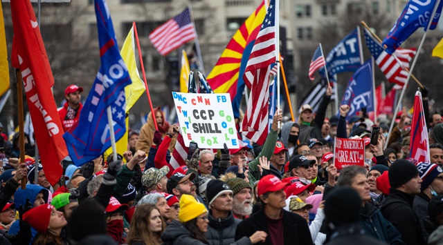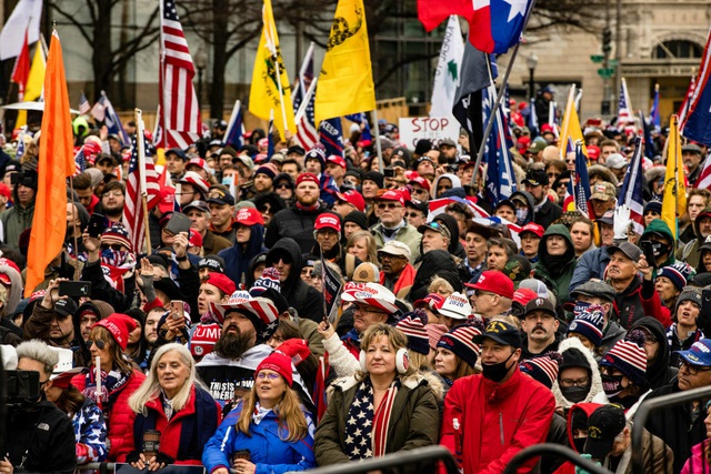 Theo Washington Post, một ngày trước khi Quốc hội bỏ phiếu xác nhận ông Biden thắng trong cuộc bầu cử tháng 11 năm ngoái, "biển" người ủng hộ ông Trump, những người chưa chấp nhận sự thật rằng ông đã thua cuộc, đổ về Washington DC. Thủ đô của nước Mỹ khẩn trương triển khai hàng loạt biện pháp để ngăn chặn bạo lực và bạo loạn. Trong ảnh: Đám đông ủng hộ ông Trump tụ tập trước quảng trường Freedom Plaza, Washington hôm 5/1.
