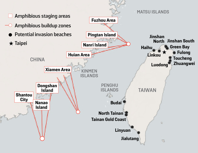 Bản đồ eo biển Đài Loan với giả định về các vị trí triển khai tên lửa và các mục tiêu (Nguồn: Foreign Policy).