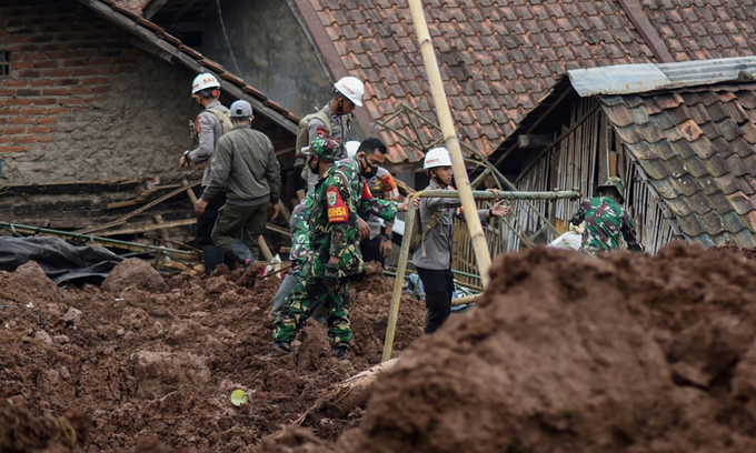 Binh sĩ và lực lượng cứu hộ Indonesia tìm kiếm nạn nhân trong vụ lở đất kép ở thị trấn Sumedang, ngày 10/1. Ảnh; AFP.