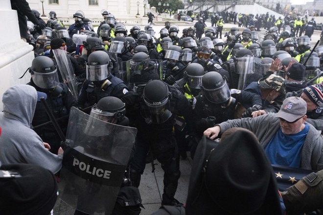 Lực lượng bảo vệ trụ sở Quốc hội Mỹ hoàn toàn bị đám đông biểu tình lấn át ngay từ đầu. Ảnh: AP.