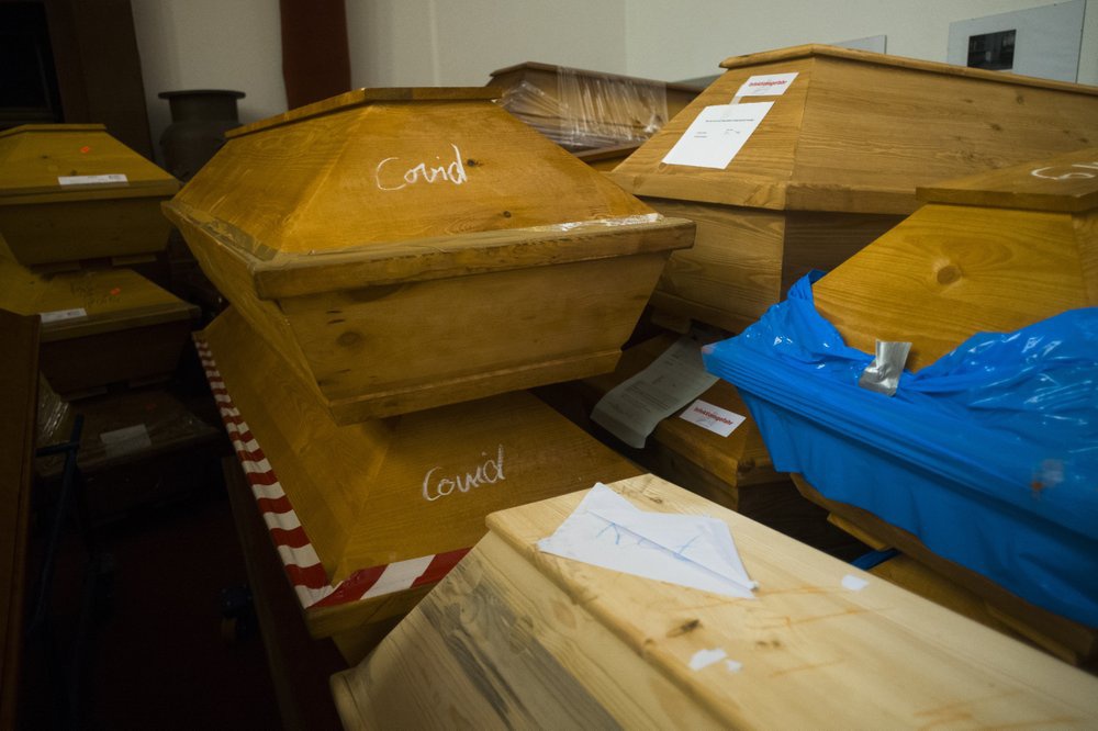 Nhiều quan tài được quấn vội vã bằng nhựa trong, những chiếc khác được dán giấy thông báo "nguy cơ truyền nhiễm", "khẩn cấp", hay chỉ đơn giản là "Covid", AP cho biết.