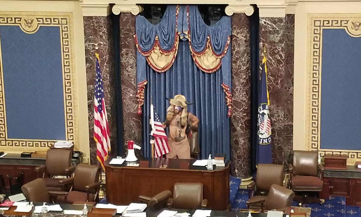 Jacob Anthony Chansley tạo dáng tại phòng họp của Thượng viện Mỹ, ngày 6/1. Ảnh:Twitter/stevennelson10.