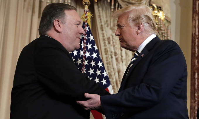 Tổng thống Donald Trump (phải) tại lễ tuyên thệ nhậm chức ngoại trưởng của Mike Pompeo ở Bộ Ngoại giao Mỹ hồi tháng 5/2018. Ảnh: AP.