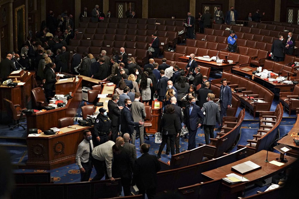 Các nghị sĩ được sơ tán ở phòng họp Hạ viện ngày 6/1. Ảnh: Bloomberg.“Mọi người đã rã đám”