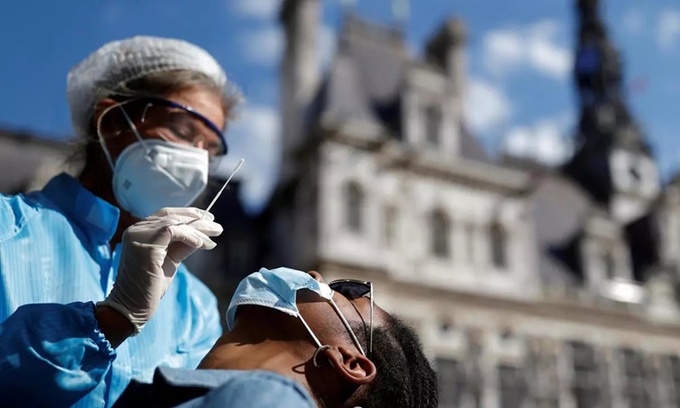 Nhân viên y tế lấy mẫu xét nghiệm Covid-19 cho một người dân ở Paris, Pháp, hồi tháng 9. Ảnh: Reuters.