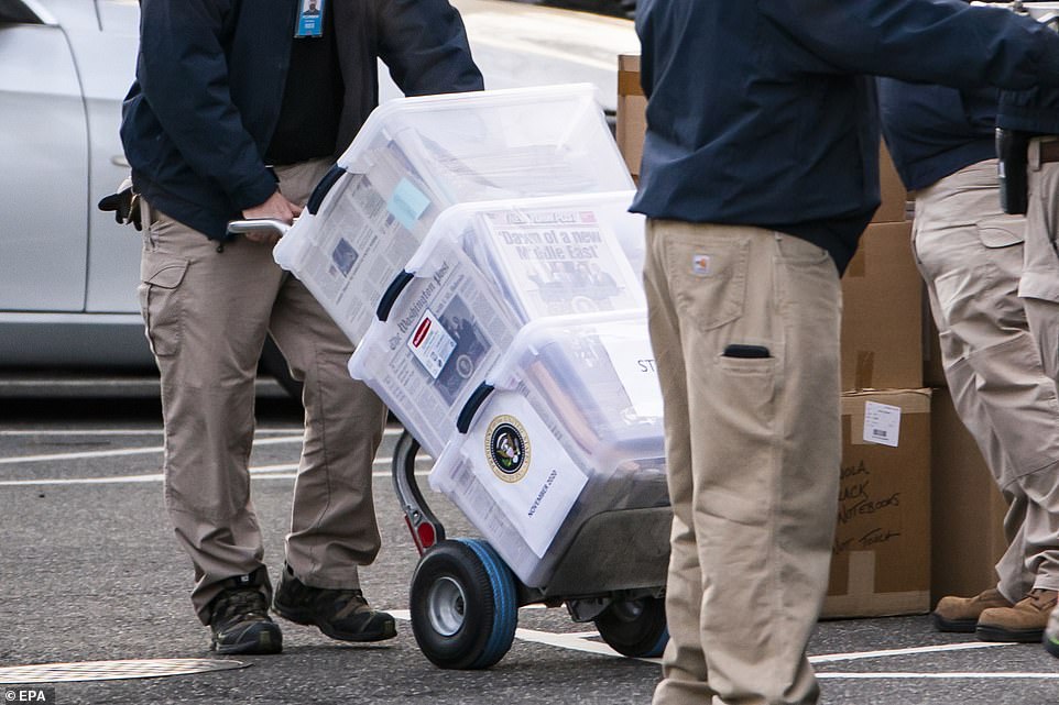 Trong một số hộp nhựa, một số báo in của New York Post, Washington Post mà ông Trump thường đọc cũng được chất lên một chiếc xe tải.