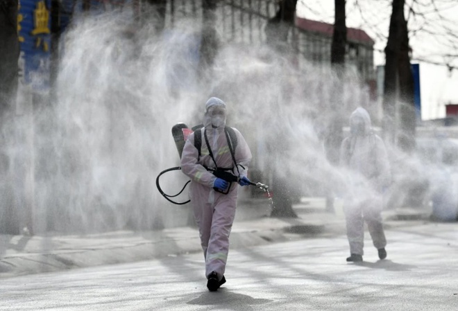 Nhân viên y tế phun chất diệt khuẩn ở Thạch Gia Trang. Ảnh: AFP.