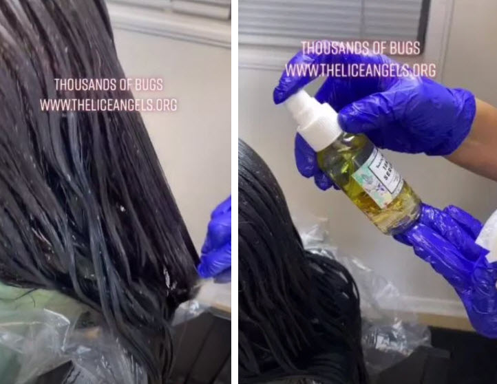 Trong video, có thể thấy, bé gái với mái tóc dài màu nâu, ngồi trên ghế phủ nilon trong khi các chuyên gia đeo găng tay để bắt đầu tiến hành làm sạch tóc đứa nhỏ. Họ bắt đầu xịt thuốc vào tóc cô bé rồi dùng lược chải đều xuống.