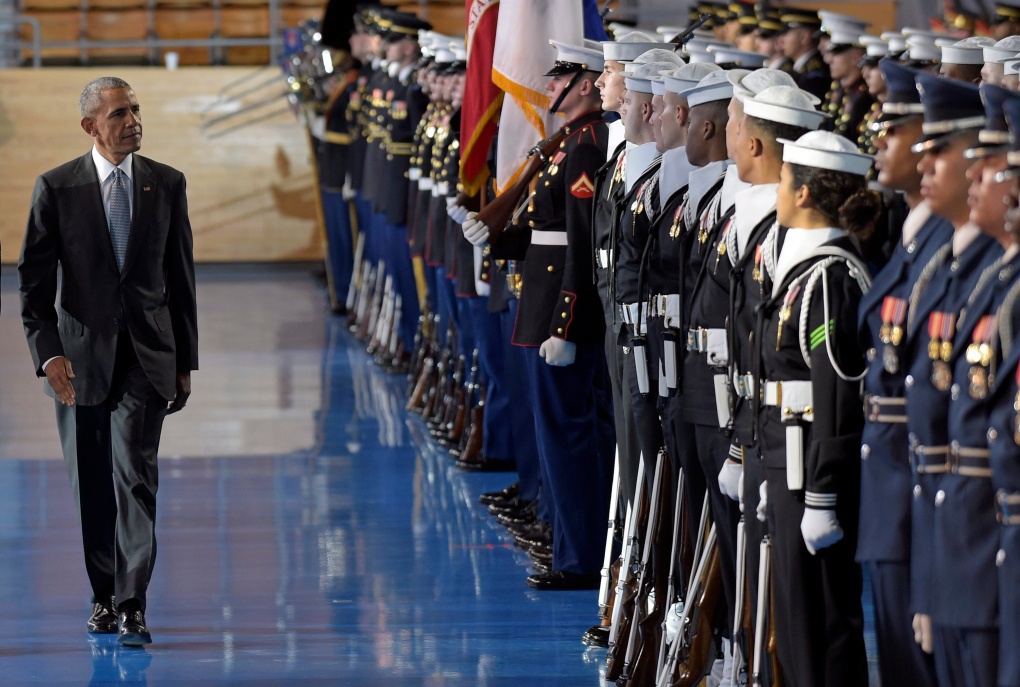 Ông Obama duyệt đội danh dự trong lễ tạm biệt mà quân đội tổ chức cho ông tháng 1/2017. Ảnh: AP.