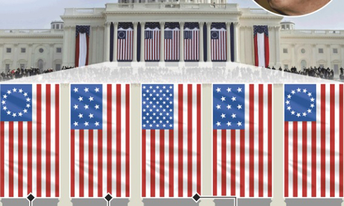 Những lá cờ sẽ xuất hiện trong lễ nhậm chức của Biden, từ trái qua phải gồm: cờ Betsy Ross, cờ 13 sao, quốc kỳ Mỹ, cờ Hải quân 13 sao và cờ Betsy Ross. Ảnh: Graphic News.