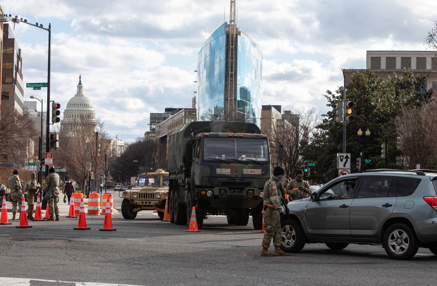 Khu vực trung tâm thủ đô Washington đã bị phong tỏa. National Mall - công viên phía trước Điện Capitol - bị đóng cửa. Hàng rào cao 2,5m đã được lập quanh Nhà Trắng, Điện Capitol, Tòa án Tối cao, và các trụ sở chính phủ khác ở Washington. Vệ binh Quốc gia và cảnh sát thủ đô có nhiệm vụ tuần tra toàn thời gian xung quanh các khu vực này. Ảnh: NPR.