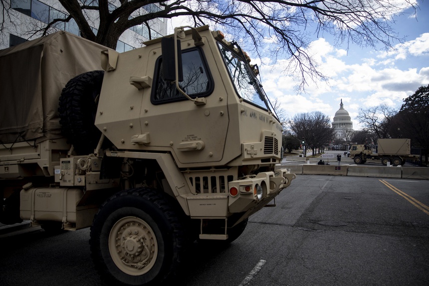 Khoảng 25.000 binh sĩ thuộc lực lượng Vệ binh Quốc gia được huy động bảo đảm an ninh ở Washington trong lễ tuyên thệ. Năm 2017, số binh sĩ được triển khai trong sự kiện ông Trump nhậm chức chỉ là 8.000. Nhiều xe thiết giáp và phương tiện quân sự được điều động về thủ đô. Ảnh: NPR.