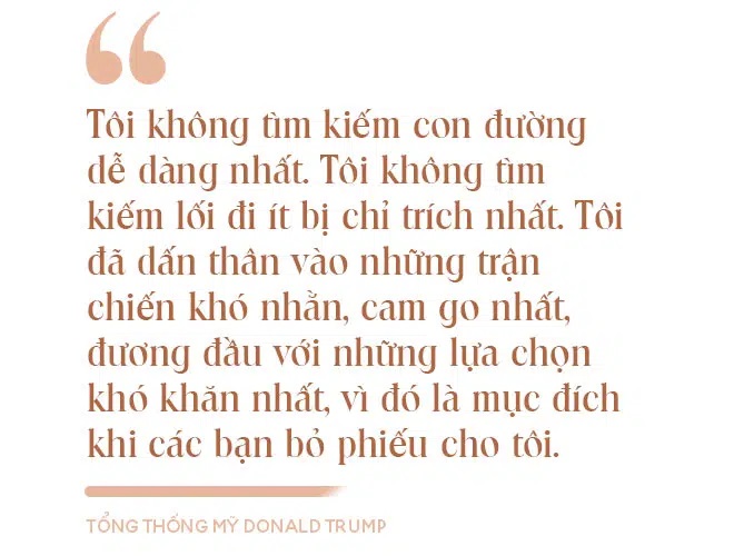Bốn năm trước, tôi đến Washington với tư cách là "người ngoài cuộc" duy nhất thực sự từng đắc cử tổng thống. Trước đó tôi chưa từng làm chính trị, mà tôi là một "người xây dựng" luôn nhìn vào những chân trời rộng mở và tưởng tượng ra những khả năng vô hạn. Tôi tranh cử Tổng thống vì tôi biết rằng vẫn còn rất nhiều "đỉnh núi" cao hơn đang chờ nước Mỹ chinh phục. Tôi biết rõ rằng tiềm năng của đất nước ta là vô hạn, miễn là chúng ta đặt nước Mỹ trước tiên.
