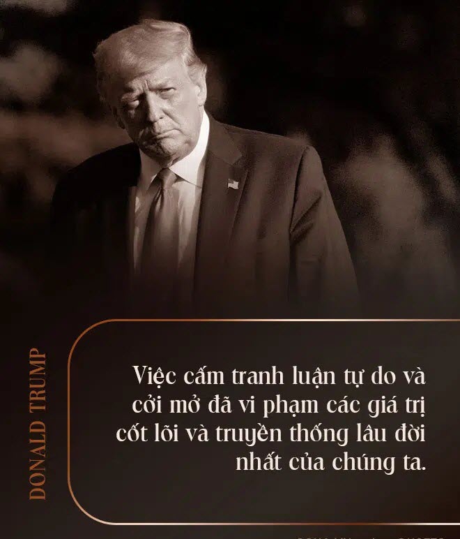 Ở Mỹ, chúng ta không nhất định phải tuân thủ tuyệt đối hoặc thực thi các quy tắc trừng phạt cứng nhắc về ngôn luận. Chúng ta không làm điều đó. Mỹ không phải là một quốc gia yếu hèn của những con người bị quy phục - những người cần được che chở và bảo vệ khỏi những người mà chúng ta không đồng tình. Đó không phải, và sẽ không bao giờ là con người của chúng ta.