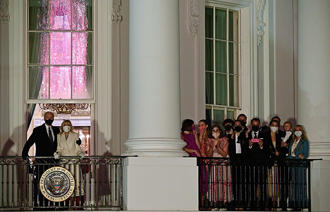 Ngay sau đó, vợ chồng Joe và Jill Biden lên ban công Truman của Nhà Trắng để xem màn bắn pháo hoa mừng ngày nước Mỹ đón chào tổng thống mới.