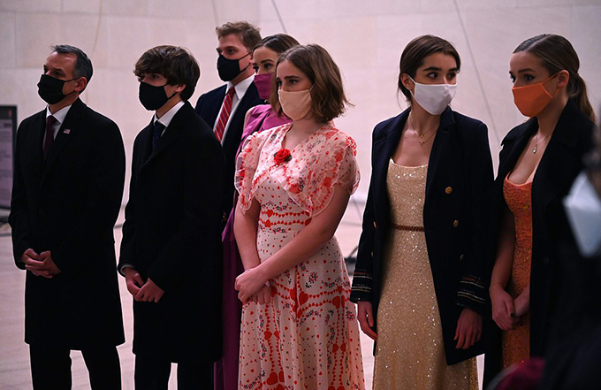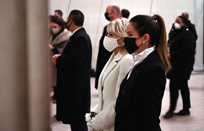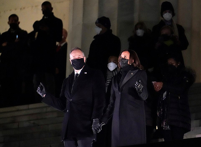 Vợ chồng tân Phó Tổng thống Mỹ Kamala Harris cũng có mặt và có bài phát biểu riêng. Cả hai đều mang trang phục màu đen, đeo khẩu trang đen và găng tay ton sur ton để phòng dịch bệnh.