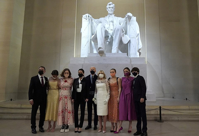 Tân Tổng thống Joe Biden chụp ảnh kỷ niệm cùng đại gia đình dưới chân tượng đài Abraham Lincohn để kỷ niệm ngày đầu tiên của nhiệm kỳ.