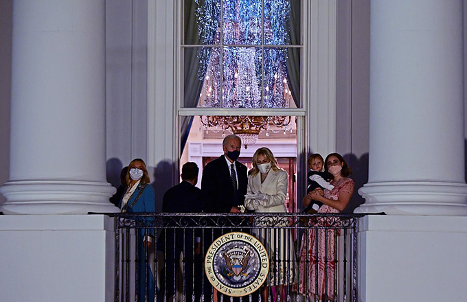 Hình ảnh vợ chồng Joe và Jill Biden lên ban công Truman của Nhà Trắng để xem màn bắn pháo hoa mừng ngày nước Mỹ đón chào tổng thống mới với các con cháu đều có mặt đông đủ trên ban công Truman của Nhà Trắng để xem màn pháo hoa lộng lẫy chào mừng tân tổng thống thứ 46 của nước Mỹ tối 20/1.