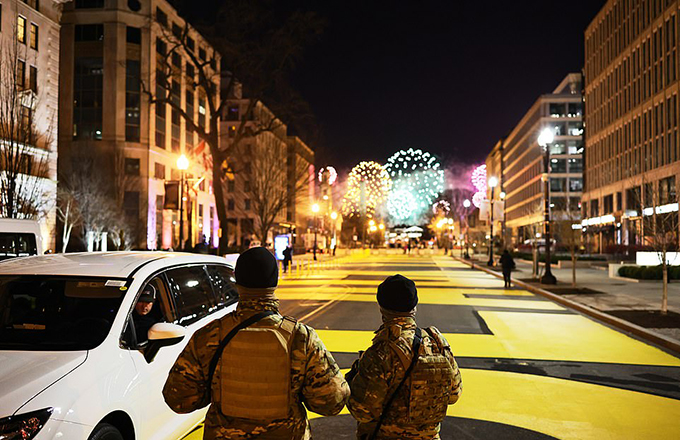 Lính Mỹ đứng canh gác trên đường phố cũng có thể ngắm pháo hoa.