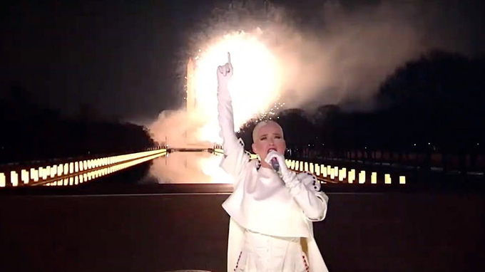 Ngoài bắn pháo hoa, buổi lễ mừng ông Biden nhậm chức còn có sự tham gia buổi diễn của nhiều nghệ sĩ nổi tiếng. Trong ảnh, Katy Perry biểu diễn trước Tượng đài Washington tối 20/1.