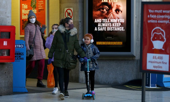 Người dân Anh đi giữa các biển hiệu kêu gọi phòng chống Covid-19 ở London hôm 25/1. Ảnh: AFP.