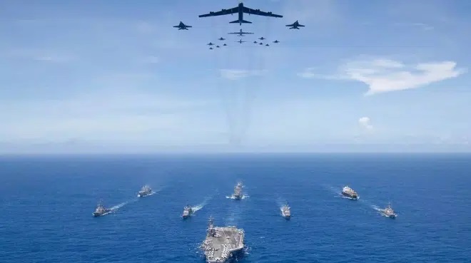 Tàu sân bay USS Ronald Reagan và hải đội tác chiến cùng oanh tạc cơ B-52 của Không Quân và chiến đấu cơ F/A 18 của Hải Quân, trên biển Philippines, trong cuộc tập trận Valiant Shield 2018. Ảnh: Hải quân Mỹ