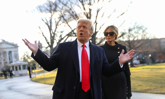 Cựu tổng thống Mỹ Donald Trump và vợ Melania chuẩn bị rời Nhà Trắng hôm 20/1. Ảnh: Reuters.