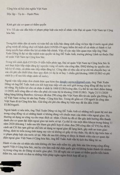 Tôi nhận được một lá đơn tố cáo Đại sứ quán Việt Nam tại Séc tiếp tay cho các dịch vụ người Việt bán với giá cắt cổ. Rất tiếc là lá đơn tố cáo lại không có họ và tên người gửi, không có các chứng cớ cụ thể, cho nên không thể đăng lên diễn đàn Tôi Và Sứ Quán được (có ảnh đính kèm.)