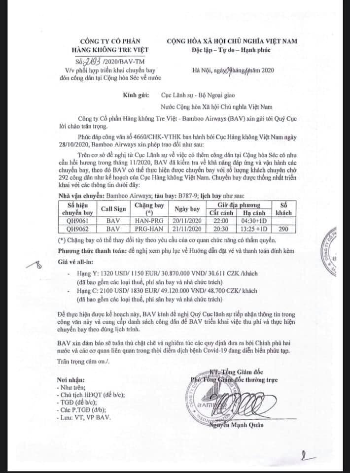 Tại Cộng hoà Séc, nơi có trên 60 nghìn người Việt, cho nên nhu cầu về nước là rất lớn. Tháng 4 năm 2020 trong chuyến máy bay do chính phủ Séc thuê hãng Bamboo chở công dân Séc về nước bằng ngân sách của chính phủ, khi bay trở về , các phòng vé đã rao bán vé, trên chuyến bay đó, chỉ sau 1 ngày đăng vé đã bán hết chỗ. Phía chính phủ Séc đã phản ứng vì họ đã trả tiền cho cả chuyến bay, nếu vì nhân đạo thì phía Đại sứ quán Việt Nam phải gửi công hàm cho phía Séc và không thu tiền vé của dân. Thế nhưng không hiểu vì lý do gì, chuyến bay đã phải bay về Việt Nam mà không có hành khách nào.