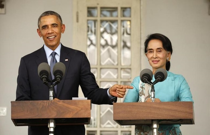 Tổng thống Mỹ Barack Obama và lãnh đạo đảng LND Aung San Suu Kyi tổ chức họp báo tại nơi ở của bà ở Yangon hồi tháng 11/2014. Ảnh: Reuters.