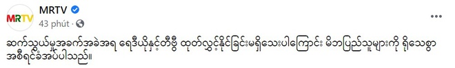 Thông báo của đài truyền hình nhà nước Myanmar MRTV trên Facebook. Ảnh: Ảnh chụp màn hình.