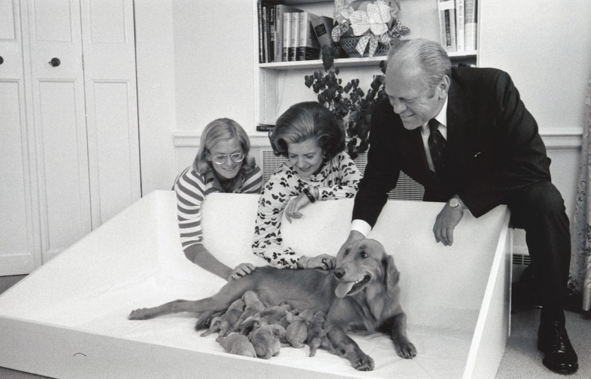 Gia đình cố Tổng thống Gerald Ford ở bên chó cưng Liberty khi nó sinh con. Ảnh: Gerald R. Ford Library.