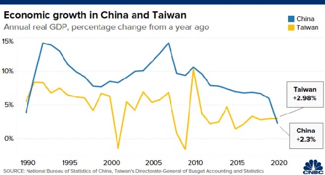 So sánh tăng trưởng kinh tế của Trung Quốc (đường màu xanh) và đảo Đài Loan (đường màu vàng) trong vòng 30 năm từ 1990-2020. Nguồn: CNBC