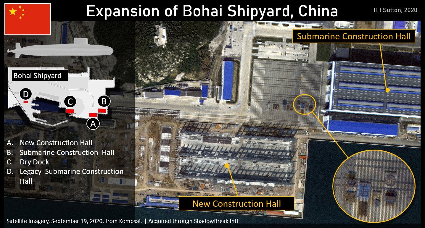 Trang USNI News của Viện Hải quân Mỹ cho biết, có 3 lớp tàu ngầm mới có thể đang được đóng tại nhà máy ở Bột Hải, bao gồm Type-096, Type-095 và Type-093B - phiên bản nâng cấp từ tàu ngầm tấn công hạt nhân Type-093.