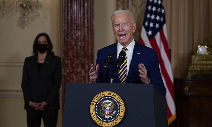 "Cuộc chiến này phải chấm dứt", Biden nói trong bài phát biểu về đối ngoại đầu tiên tại Bộ Ngoại giao hôm 4/2. Ông cho biết bài phát biểu nhằm gửi đi thông điệp rõ ràng với thế giới rằng "Mỹ đã trở lại".