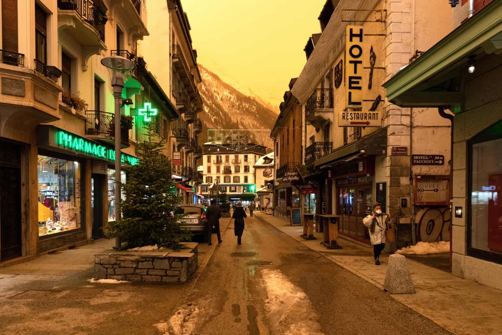 Theo SRF Meteo, kênh dự báo thời tiết của đài truyền hình quốc gia Thụy Sĩ, các hạt bụi có nguồn gốc từ những khu vực phía tây bắc châu Phi, bao gồm Mauritania, Mali và Algeria. Bụi ở Sahara biến bầu trời Vallee de Chamonix, Haute Savoie, Pháp thành màu cam. Ảnh: Shutterstock.