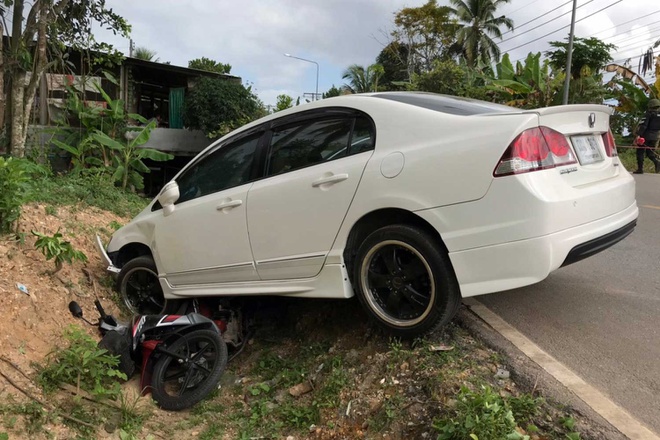 Hiện trường vụ va chạm giữa ôtô và xe máy của hai người đàn ông ở huyện Thung Yang Daeng, Thái Lan, hôm 6/2. Ảnh: Bangkok Post.
