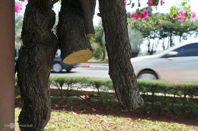 Một số trụ bị cưa trụi, số khác trồng nhiều cây đan xen, kẻ xấu chọn thân to, đẹp để ra tay, khiến những trụ hoa giấy đang vào mùa trổ hoa "nửa sống nửa chết".